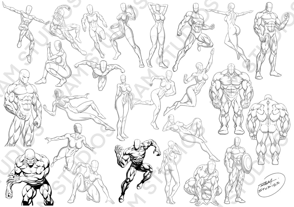 These heroic poses can be great to learn from and as a reference point to draw your own unique character concepts. They are quick and easy to use and I have included a nice variety of poses that include flying, standing, crouching, foreshortening, and some with exaggerated proportions and rendering.