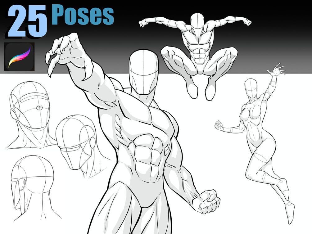 These are digital stamps for the Procreate app. This set includes 25 custom drawn poses that will help you with comics, anatomy, and figure drawing. You get a variety of male and female figures to work with. I have also included various head angles to help you draw your close ups.